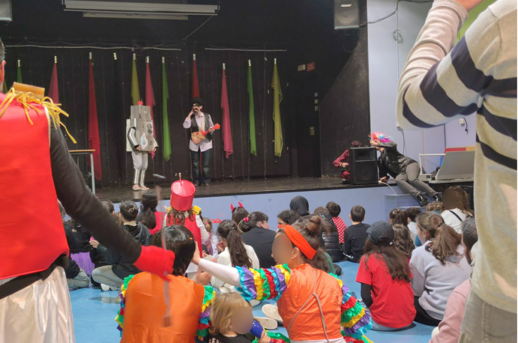 Després de la rua de l’escola comencem una festa a la qual tots participem. Fem una gran tarda en família plena de concursos, premis i molta diversió.